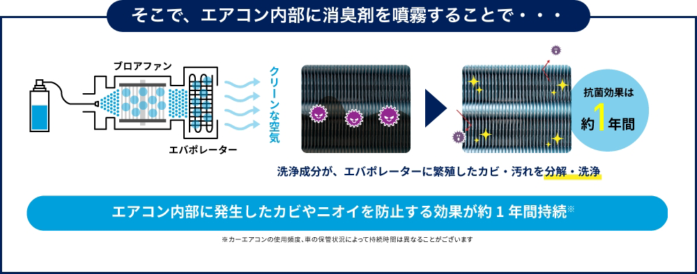 洗浄成分がエバポレーターに繁殖したカビ・汚れを分解・洗浄し、さらにカビやニオイを防止する効果も発揮します✊