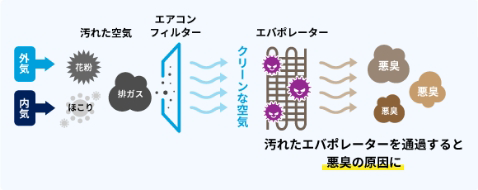 ご家庭のエアコンと同様に車のエアコンも内部で結露が発生し、カビや菌が繁殖しています。