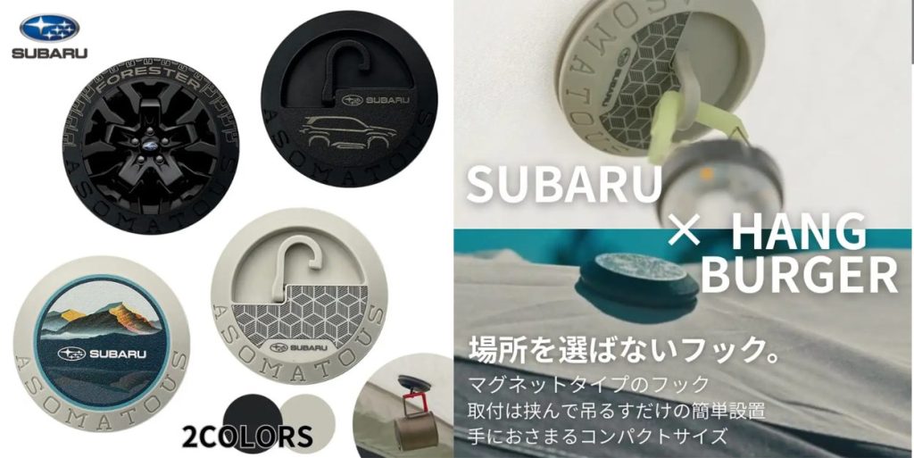 キャンプサイトで、愛車のボディにハングバーガーを貼り付け、スバルロゴの入ったゴールゼロを吊るす……。
